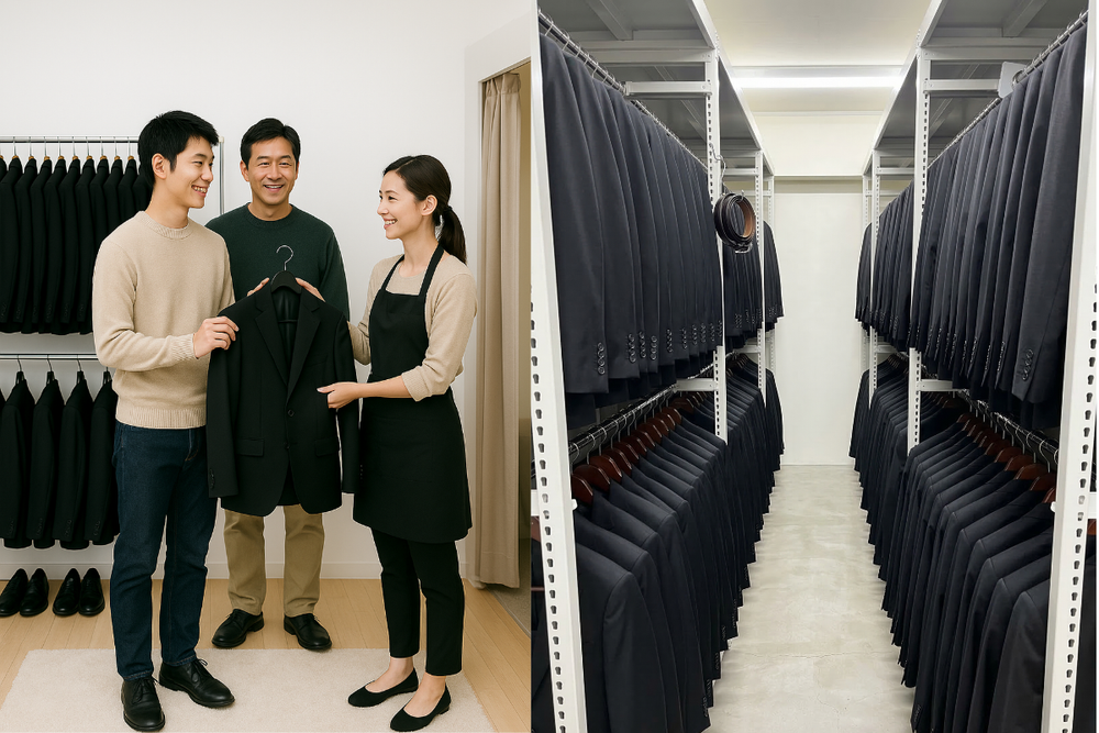 「サイズがない」とお困りの方へ 名古屋で最大級のサイズ展開と在庫数 【最短20分でお渡し】お電話一本でサイズを確保します 🤵 男性用:ウエスト140cmまで 特大サイズの喪服スーツはもちろん、首回りの太いワイシャツや大きなサイズの靴まで、**全身フルセット**で揃います。 購入すると高額な特注サイズも、レンタルなら圧倒的にお得です。 👩 女性用:17号〜25号まで ゆったり着られるデザインを豊富にご用意。各サイズ10着以上の在庫があるため、**「着比べて一番綺麗に見える一着」**をお選びいただけます。靴ずれしにくいパンプスも試着可能です。 📍 試着ができるから「入らない」失敗なし...